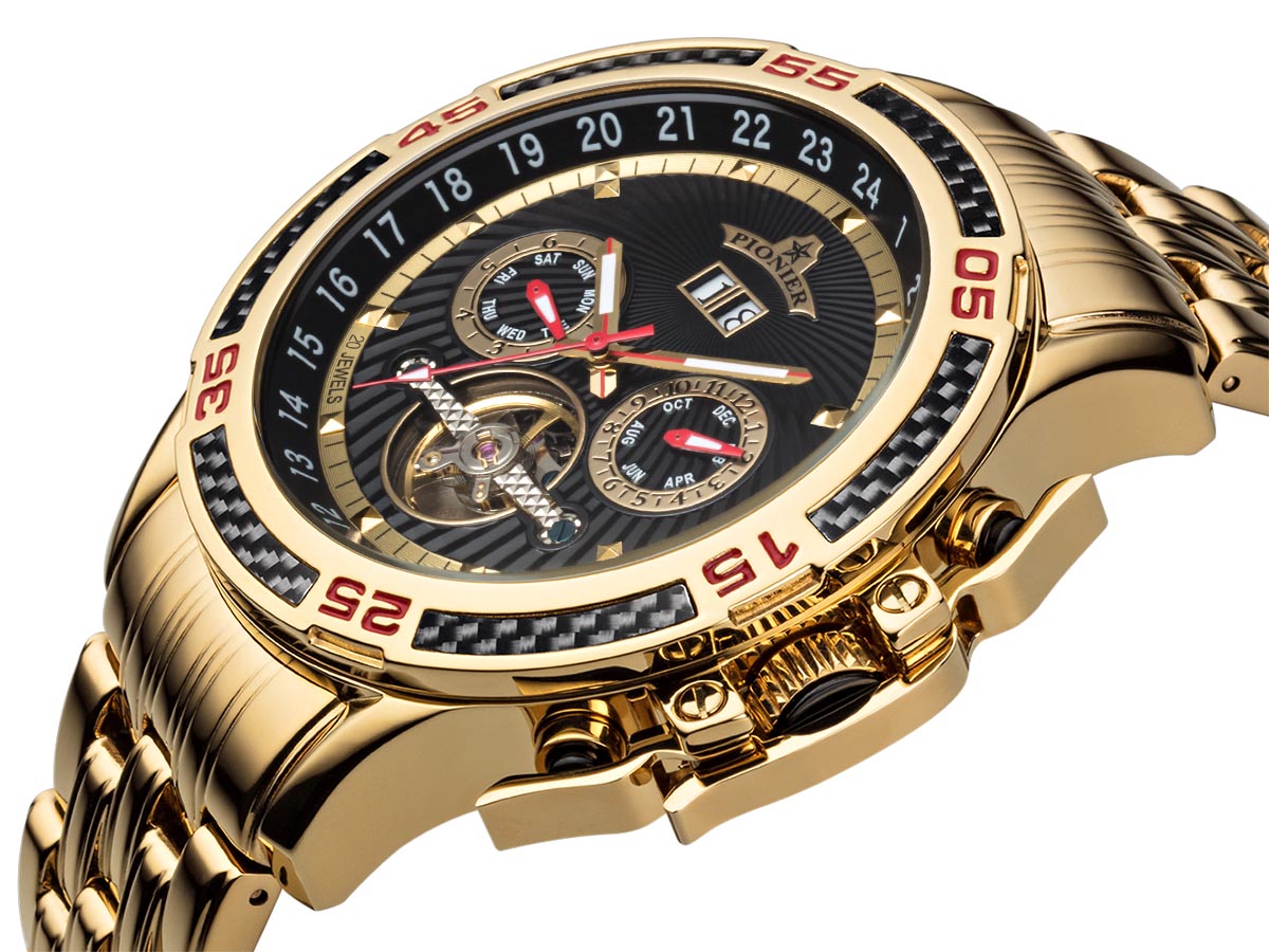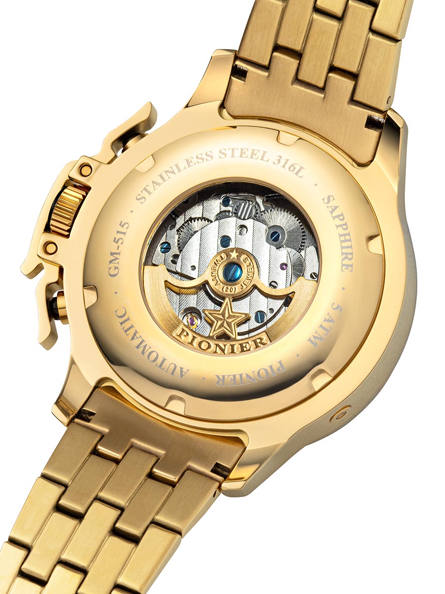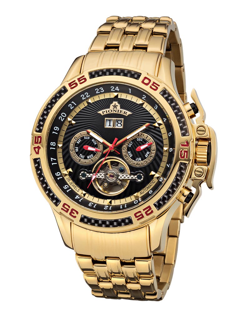 Made in Germany full calendar Amsterdam Pionier watch for men black, gold, and metal bracelet