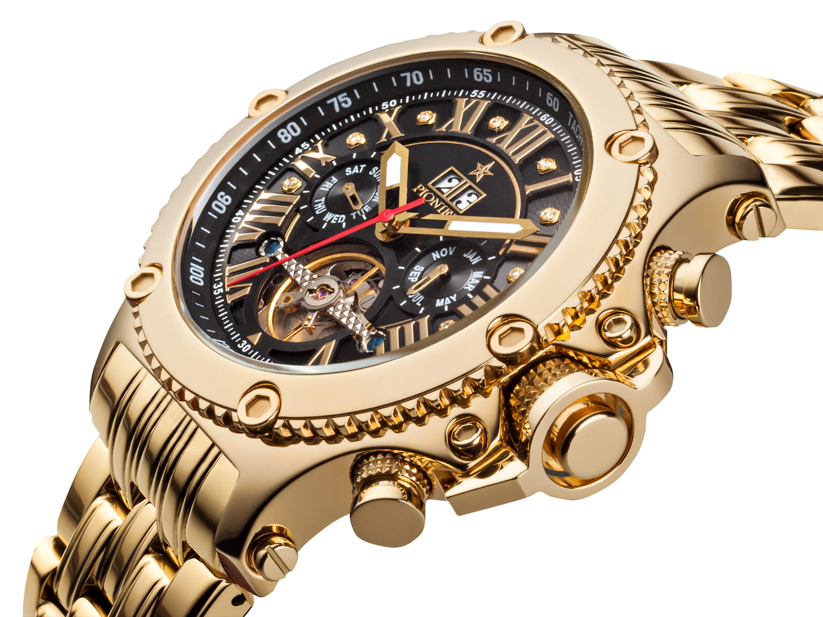 The marvelous finish on the case and the sturdy, sophisticated look will make for an unforgettable timepiece. The elegant bridge design, which showcases the mechanism, will mesmerize anyone. Everything about the New York Diamonds Pionier automatic calendar watch screams precision.