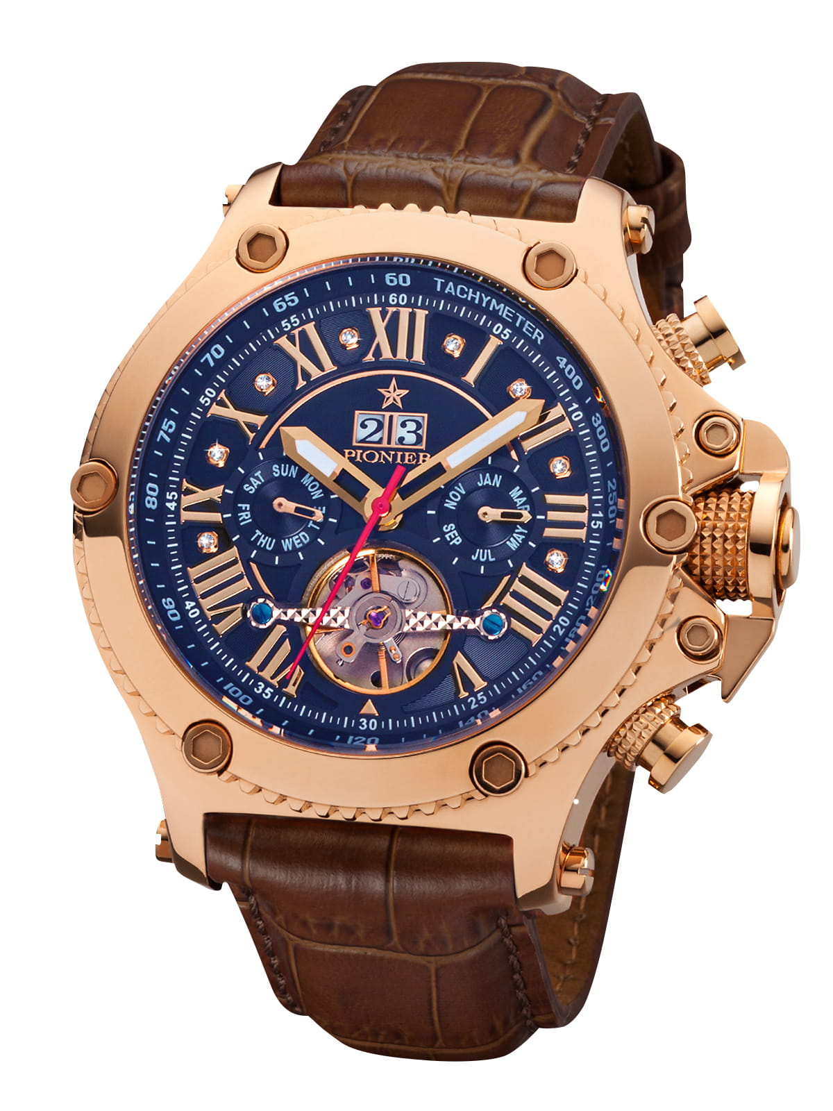 The marvelous finish on the case and the sturdy, sophisticated look will make for an unforgettable timepiece. The elegant bridge design, which showcases the mechanism, will mesmerize anyone. Everything about the New York Diamonds Pionier automatic calendar watch screams precision.