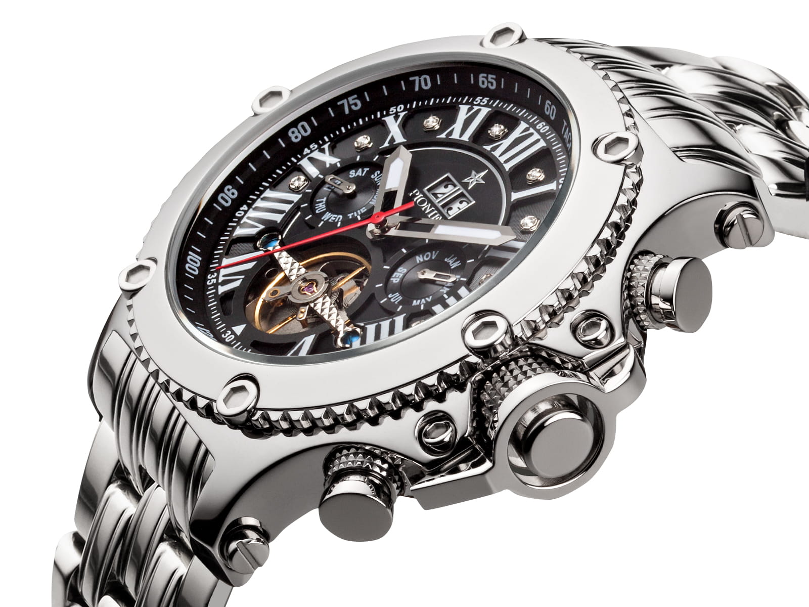 The marvelous finish on the case and the sturdy, sophisticated look will make for an unforgettable timepiece. The elegant bridge design, which showcases the mechanism, will mesmerize anyone. Everything about the New York Diamonds Pionier automatic calendar watch screams precision.
