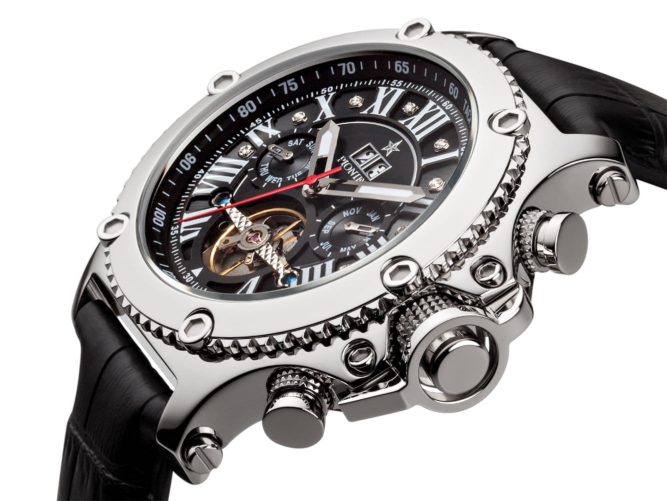 The marvelous finish on the case and the sturdy, sophisticated look will make for an unforgettable timepiece. The elegant bridge design, which showcases the mechanism, will mesmerize anyone. Everything about the New York Diamonds Pionier automatic calendar watch screams precision.