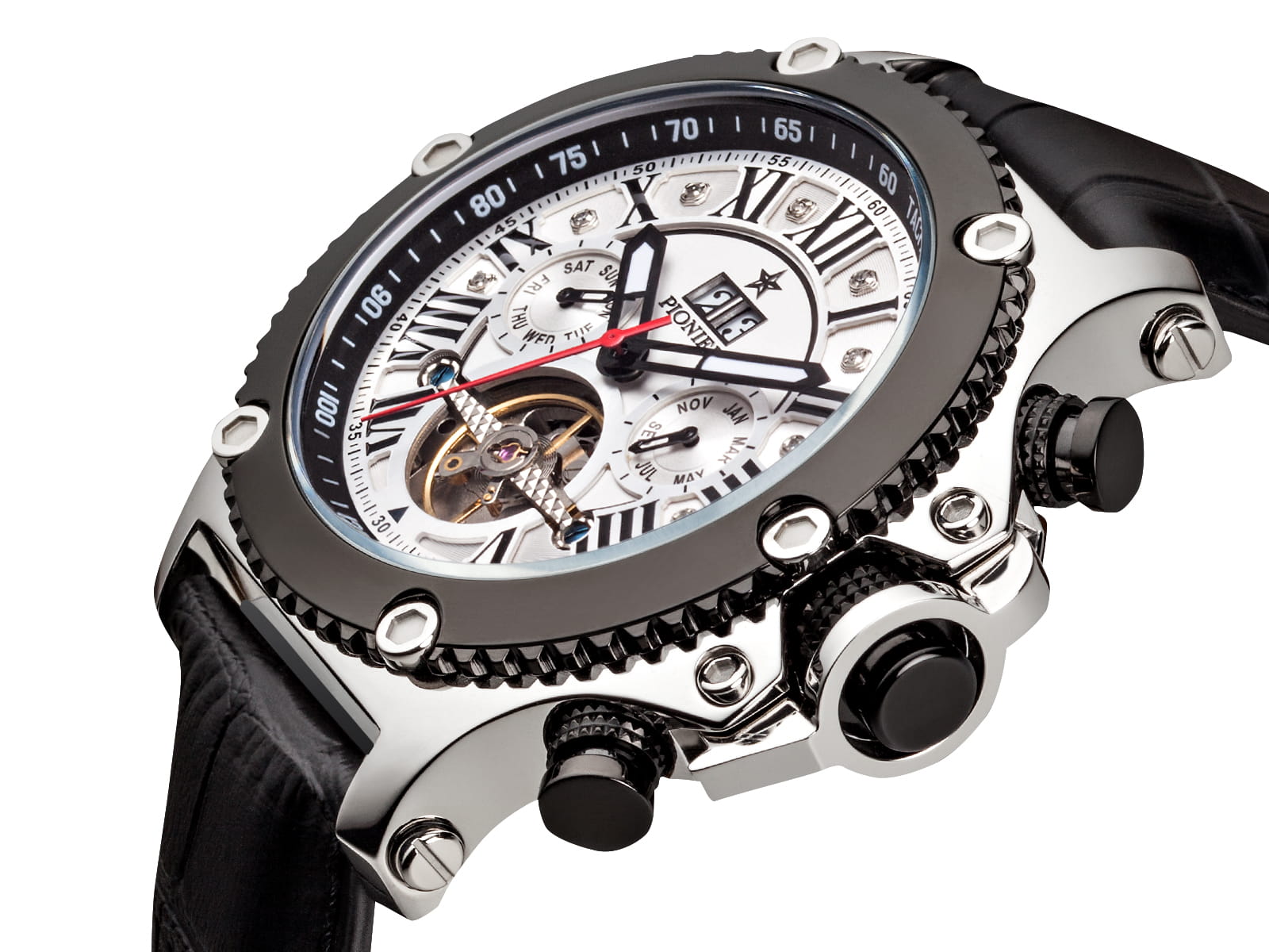 The marvelous finish on the case and the sturdy, sophisticated look will make for an unforgettable timepiece. The elegant bridge design, which showcases the mechanism, will mesmerize anyone. Everything about the New York Diamonds Pionier automatic calendar watch screams precision.