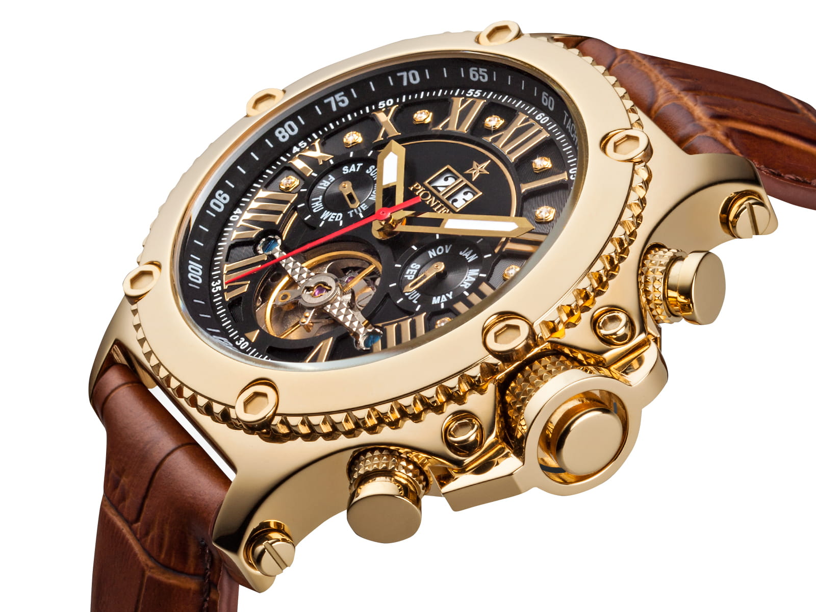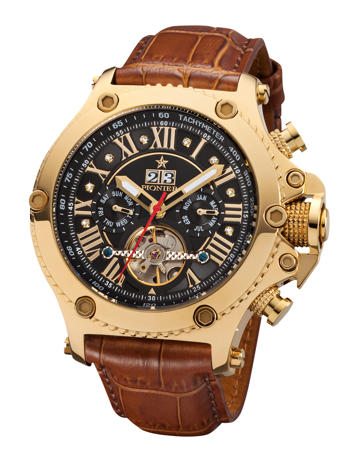 The marvelous finish on the case and the sturdy, sophisticated look will make for an unforgettable timepiece. The elegant bridge design, which showcases the mechanism, will mesmerize anyone. Everything about the New York Diamonds Pionier automatic calendar watch screams precision.