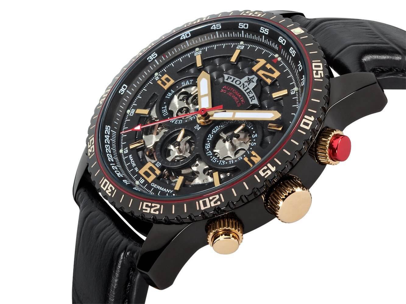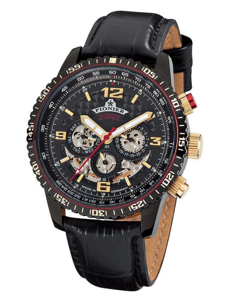 Full calendar automatic timepiece Made in Germany Barbados by Pionier with black dial and black leather band