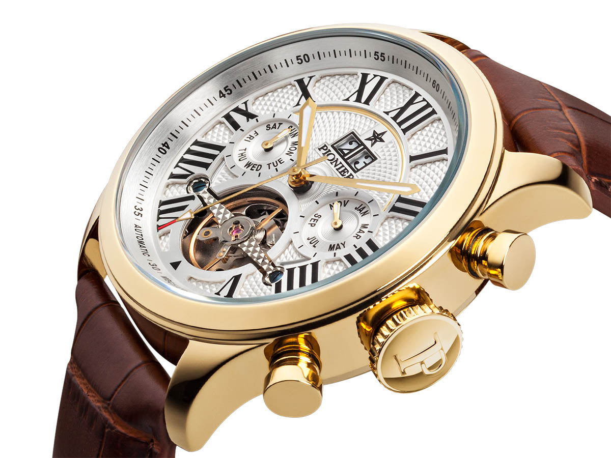 Automatic full calendar Havana Pionier watch from Germany with white face and gold color case in a brown leather band
