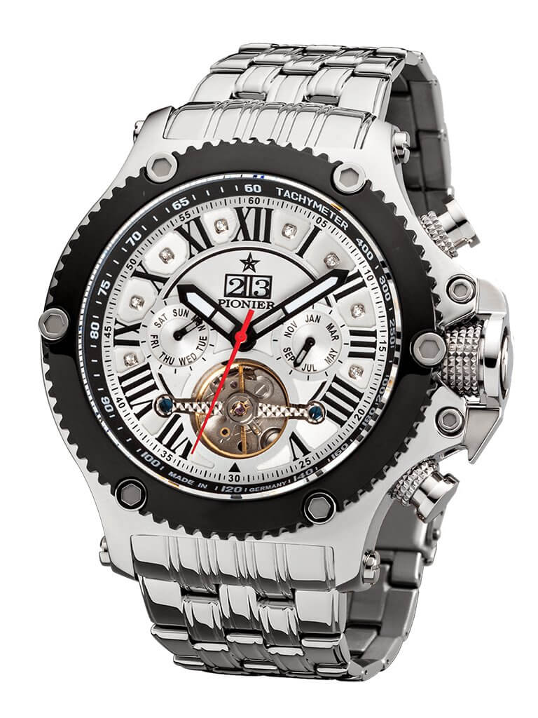 The marvelous finish on the case and the sturdy, sophisticated look will make for an unforgettable timepiece. The elegant bridge design, which showcases the mechanism, will mesmerize anyone. Everything about the New York Diamonds Pionier automatic calendar watch screams precision.