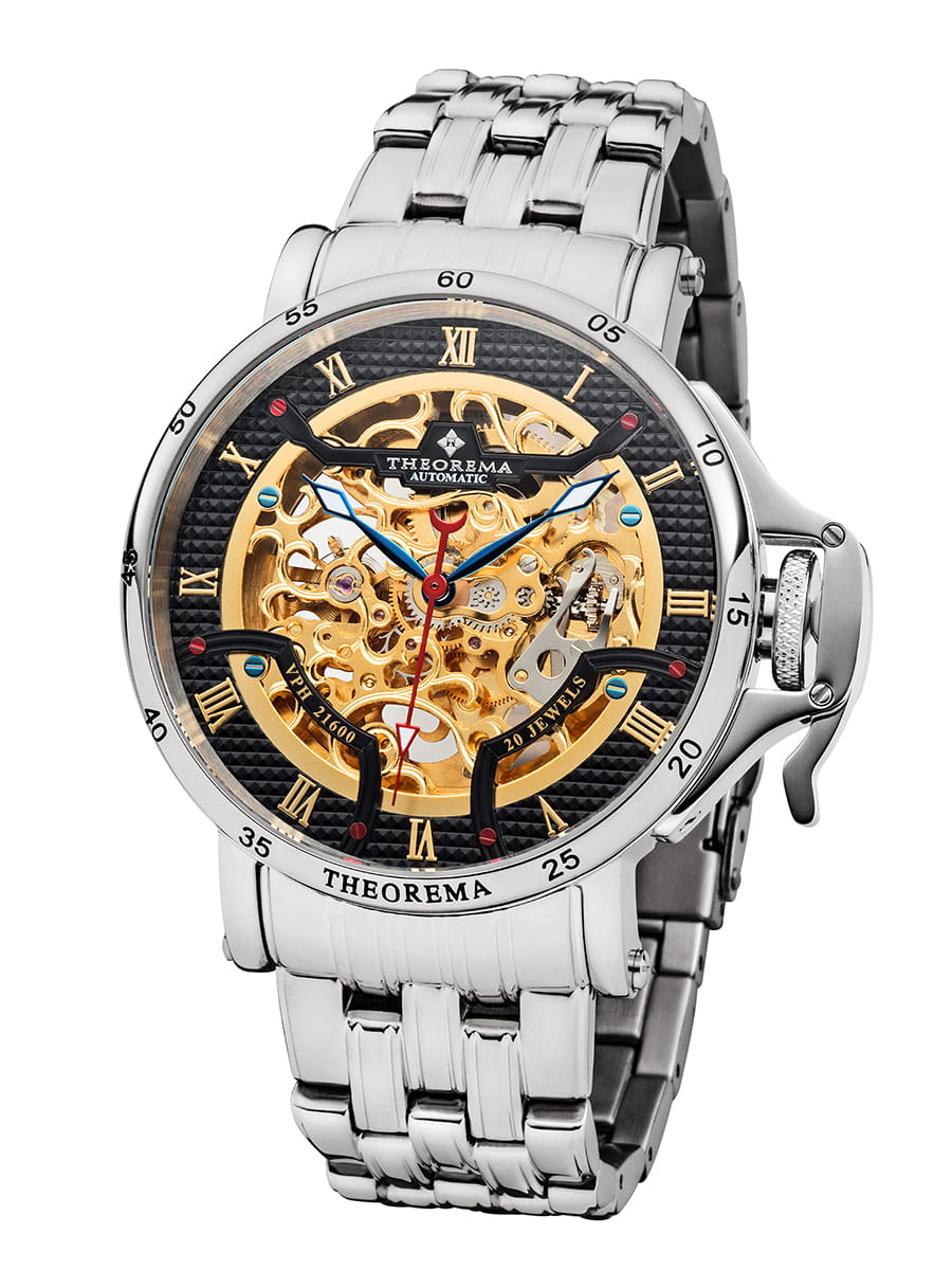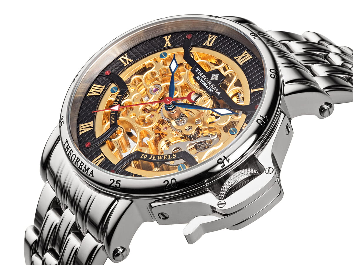 Skeleton see through automatic watch with protected crown design from the Made in Germany Madrid Theorema collection